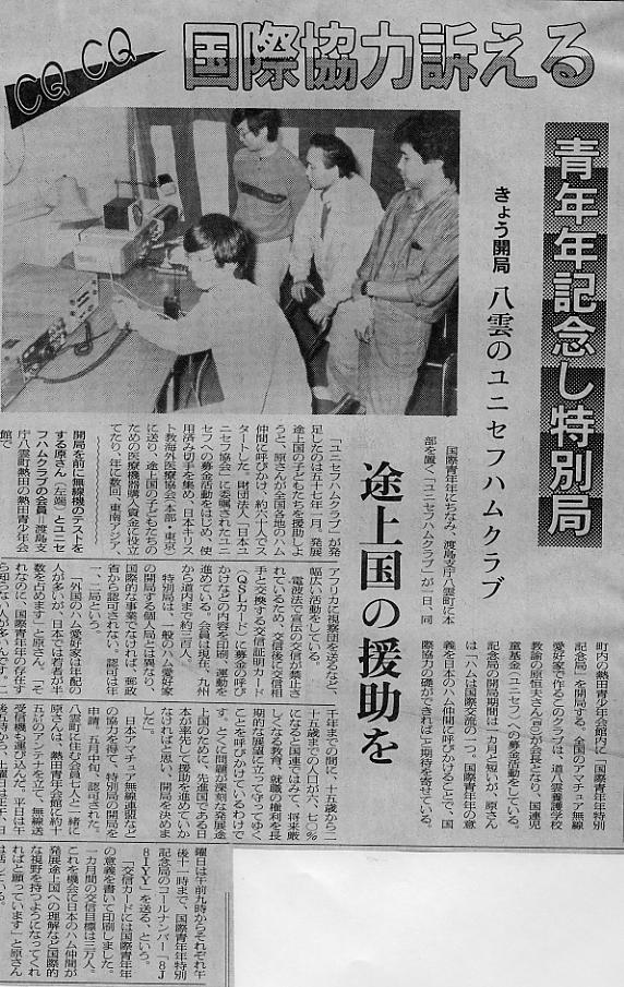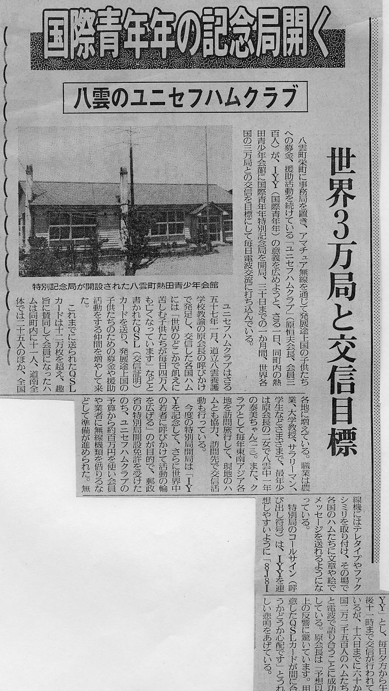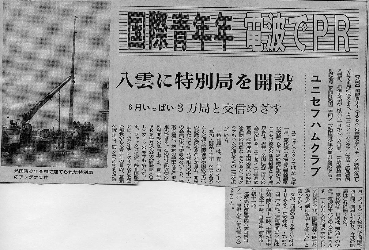 IYY特別記念局の目的 IYY(国際青年年)を記念し、アマチュア無線をとおして、青年年のテーマ「参加、開発、平和」について、ともに考え参加する。