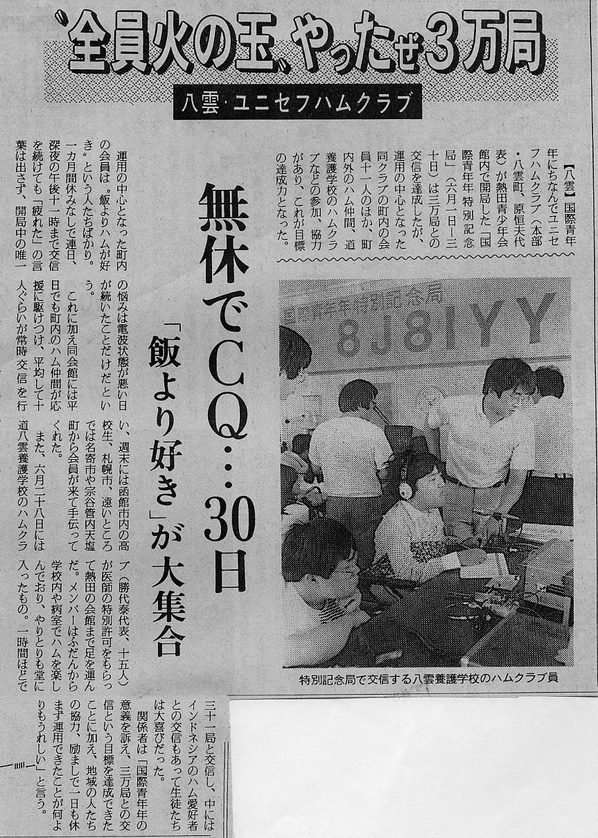 元々は、日本ユニセフハムクラブの事業として企画として計画されたのですが、特別局を開設する地元八雲町のアマチュア無線仲間の協力がなければ、とても30日間という長期間の運用は出来ません。会場探しからはじめ、アンテナ設営などの準備も含め、八雲アマチュア無線クラブ(JH8YGC)、国立療養所八雲病院アマチュア無線クラブ(JA8YOR)、北海道八雲養護学校アマチュア無線クラブ(JH8YFI)、JARL渡島檜山支部など多くの協力を得て、開局までこぎ着けました。